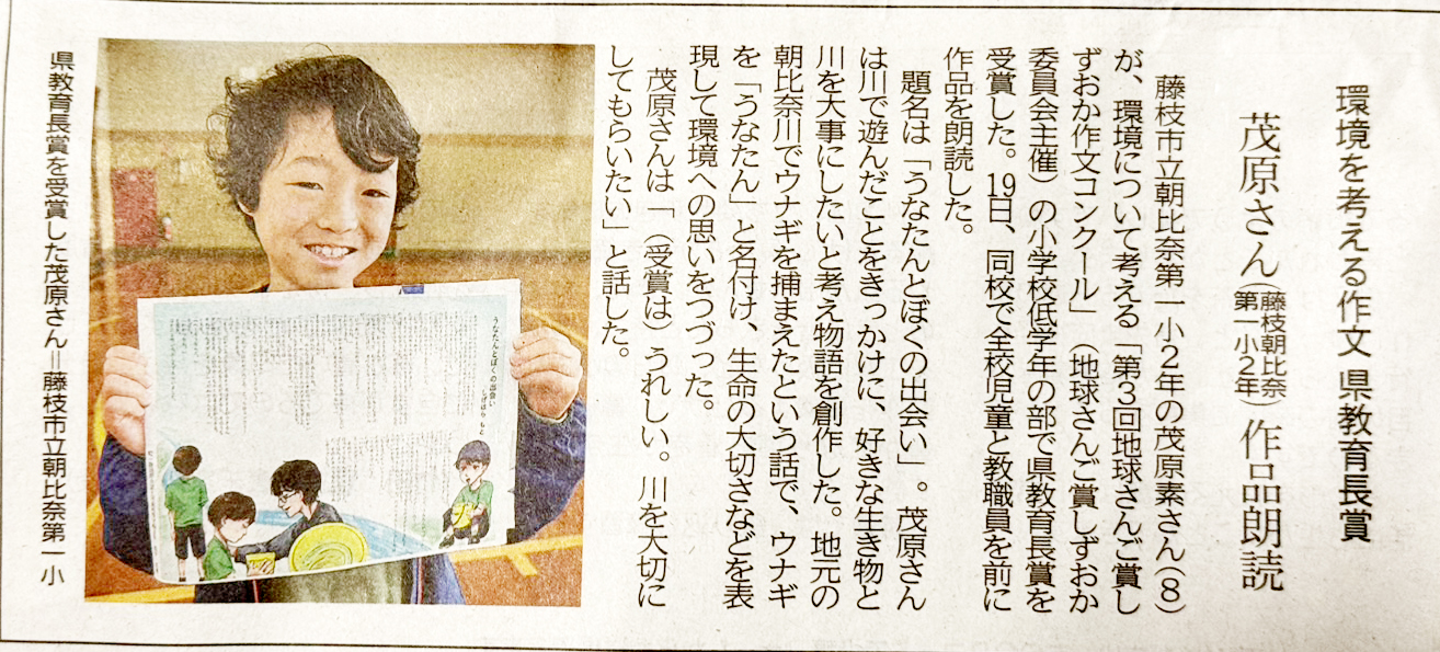 静岡県藤枝市(2026年3月XX日) — 藤枝市立朝比奈第一小学校2年生の茂原素さん(8)が、環境について考える「第3回地球さんご賞しずおか作文コンクール」の小学校低学年の部において、最高賞にあたる県教育長賞を受賞しました。これを受け、同校の終業式にて全校児童と教職員を前にした作品朗読会が行われました。