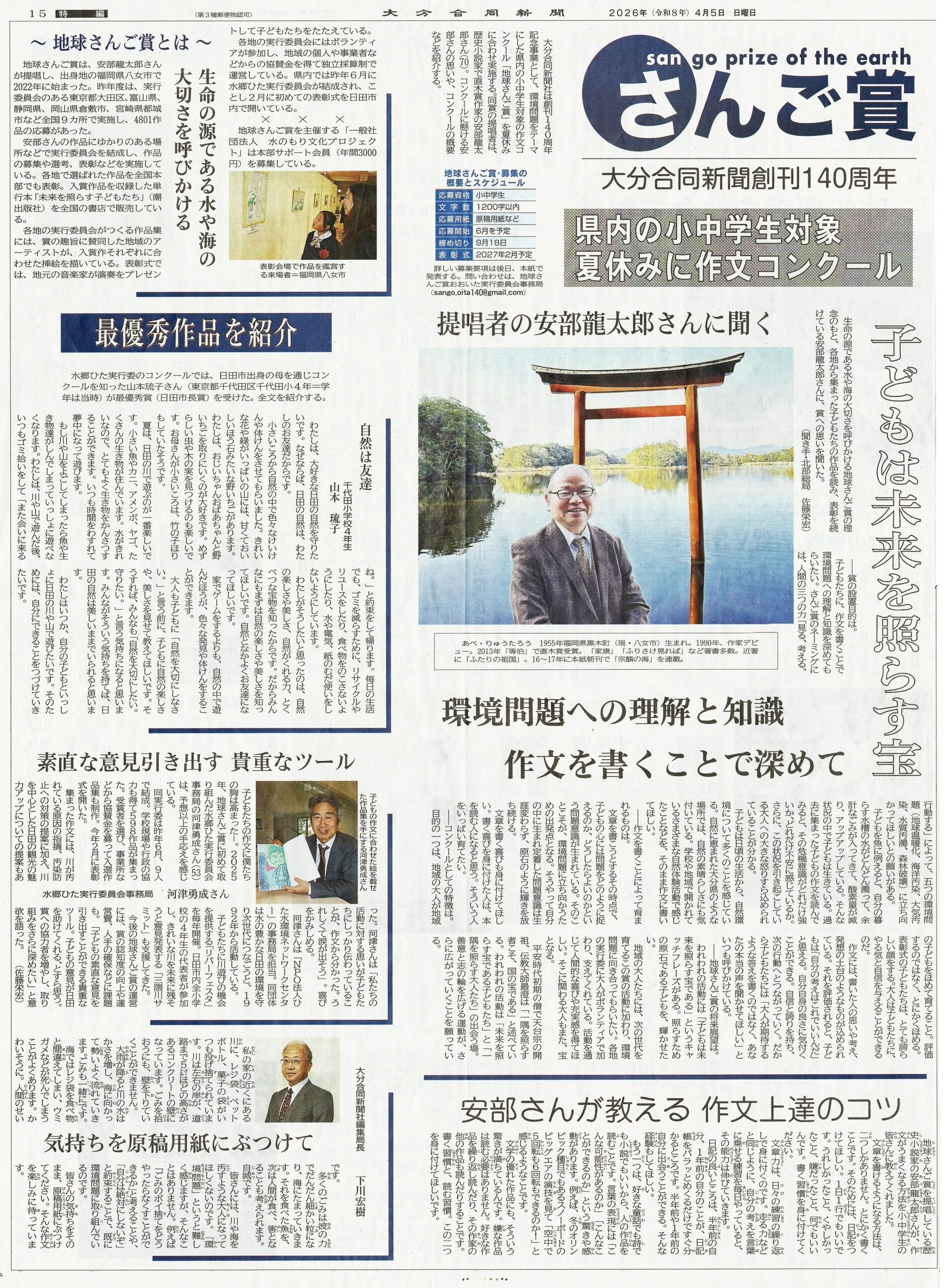 2026年4月5日、大分合同新聞の朝刊にて、同紙創刊140周年を記念した「地球さんご賞」の大型特集が掲載されました。