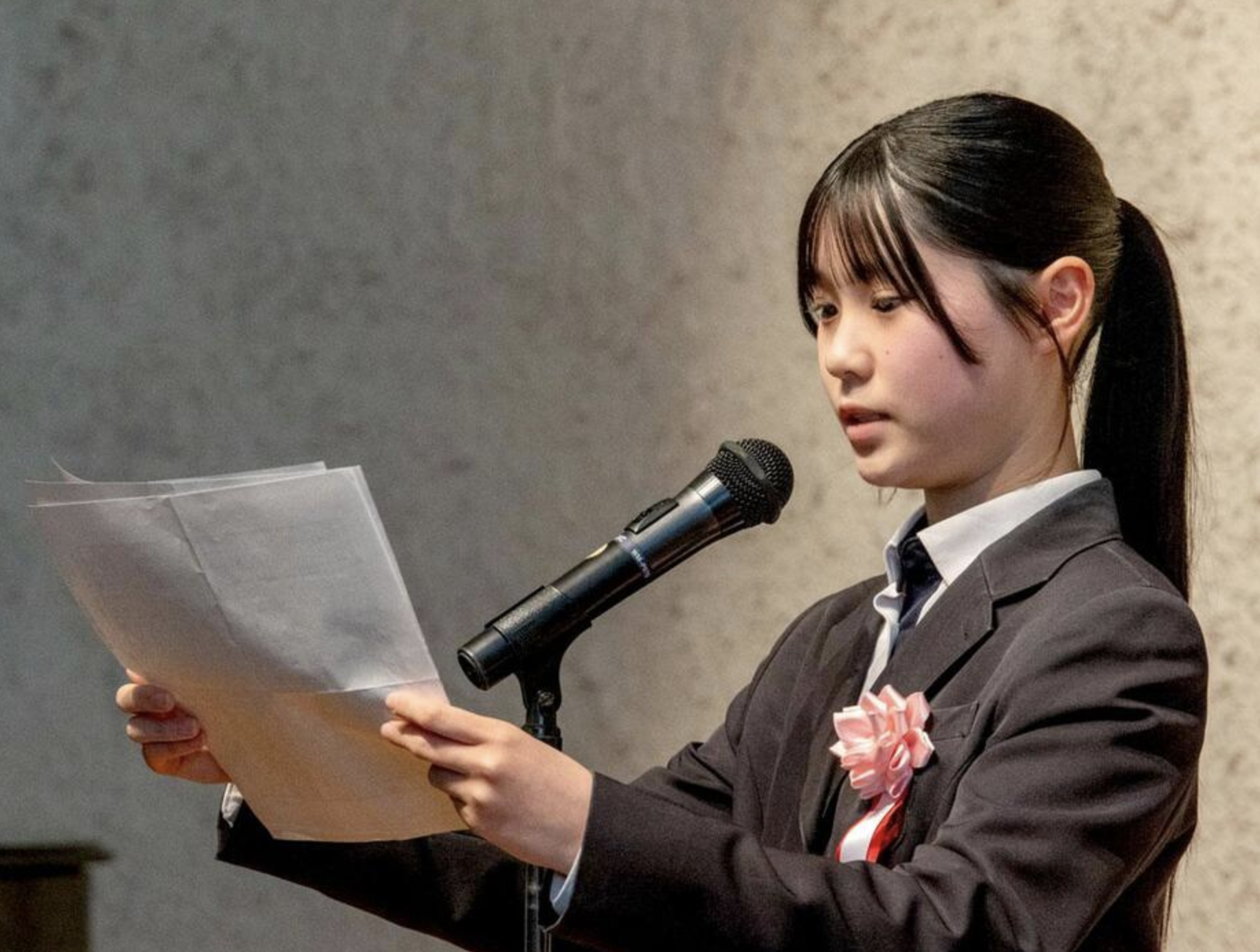 最優秀賞には、倉敷市立南中学校3年の岡真悠美さんの「できることってなんだろう?」が選ばれた。式後、岡さんが自ら作文を朗読。山下さんは「岡さんの作品は、児島湖流域環境保全推進ポスターを描く中、児島湖の実態と美しくなってほしいと願う気持ちから、何ができるのかと考える。体験を通して現実を見つめ、考えて、行動する。『すっー』と絵の具が広がっていく描写によって、美しい児島湖や自然を思う気持ちが伝わっていくようで、印象的だった」と評する。